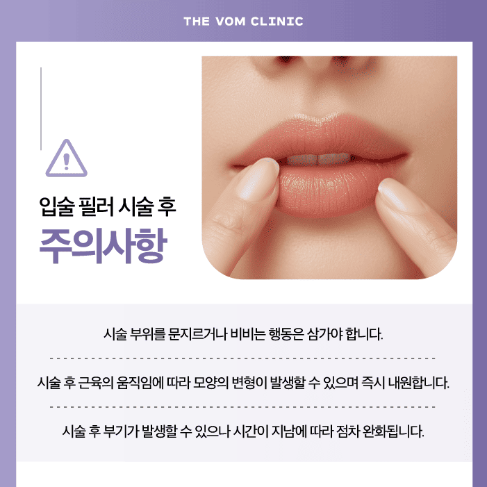입술필러 시술 후에는 시술 부위를 만지거나 자극하는 행위는 피해야 합니다. 가볍게 눌러보는 행동조차도 주입된 필러의 위치에 영향을 줄 수 있기 때문입니다.