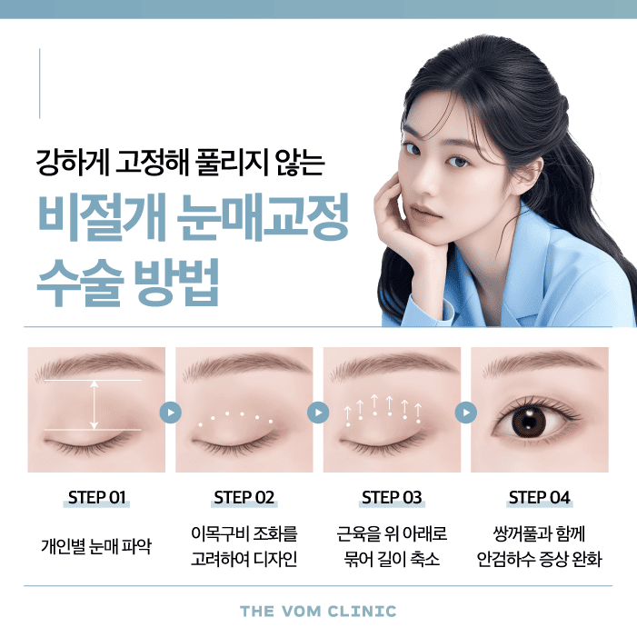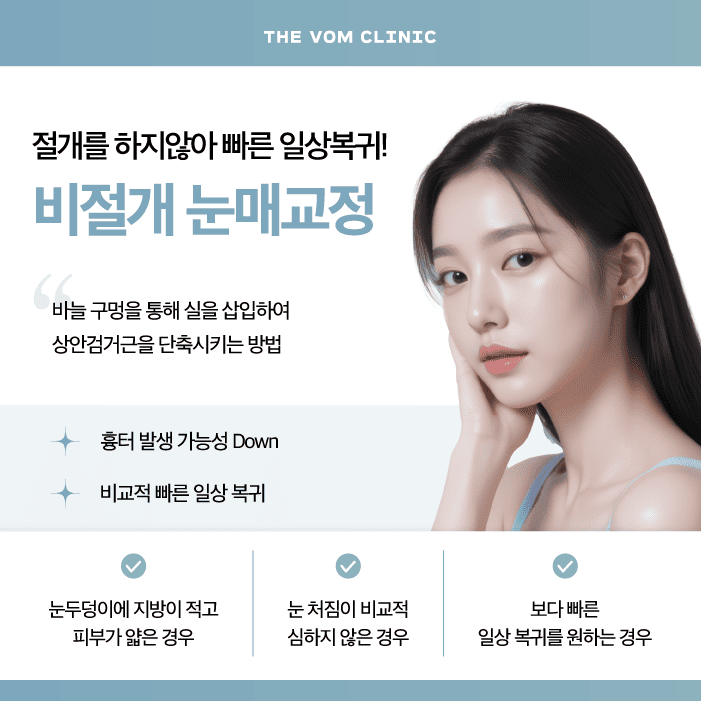 피부 절개 없이 실을 통해 상안검거근의 길이를 조절하는 접근 방식입니다. 이 방식은 눈꺼풀 지방이 적고, 피부 두께가 얇은 경우 고려될 수 있으며, 비교적 회복 기간이 짧은 편입니다.