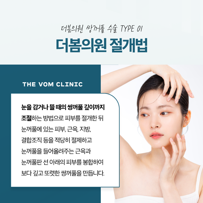 눈꺼풀 피부를 일정 부분 절개하여 쌍꺼풀 라인을 만드는 방식입니다. 단순히 피부를 자르는 것이 아니라, 절개 후 눈꺼풀 안쪽의 지방, 근육, 결합조직 등을 정리하고, 라인을 고정함으로써 보다 또렷한 쌍꺼풀을 형성해 볼 수 있습니다.