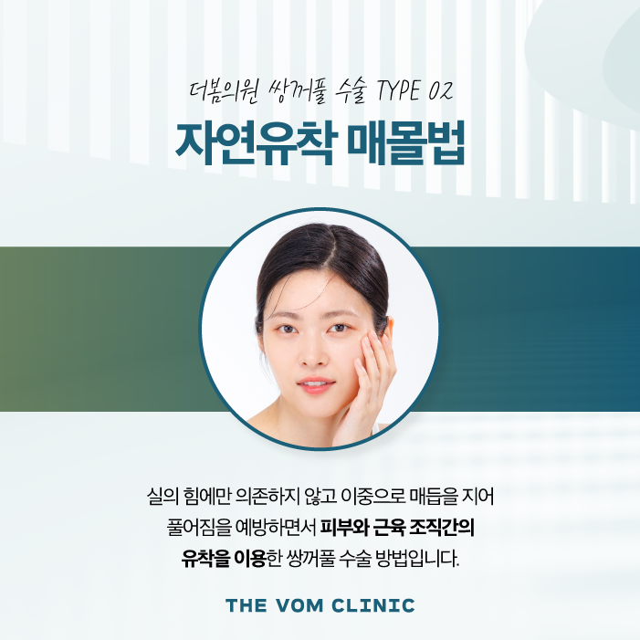 절개 없이 눈꺼풀에 실을 이용해 쌍꺼풀 모양을 고정하는 방법입니다. 피부에 작은 공간을 통해 실을 넣어, 원하는 위치에 고정함으로써 자연스럽고 깔끔한 쌍꺼풀을 형성해 볼 수 있습니다.