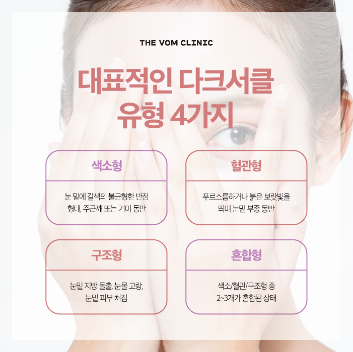 다크서클의 유형은 크게 4가지로 나눠지며, 자신에게 해당되는 부분이 있는지 잘 살펴보세요!