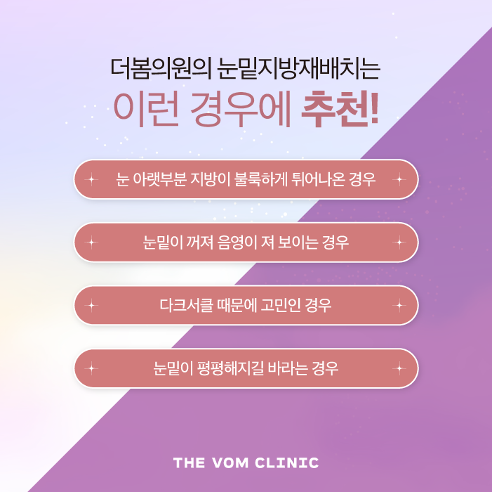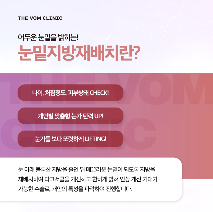 나이가 들수록 눈 밑에 지방이 쌓여 부풀어 오르거나 피부가 처지는 문제로 걱정이 많으신가요? 그런 분들 중에는 눈 밑이 불룩해져 다크서클이 강조되고, 피곤하고 지친 인상으로 이어지는 경우가 있습니다.