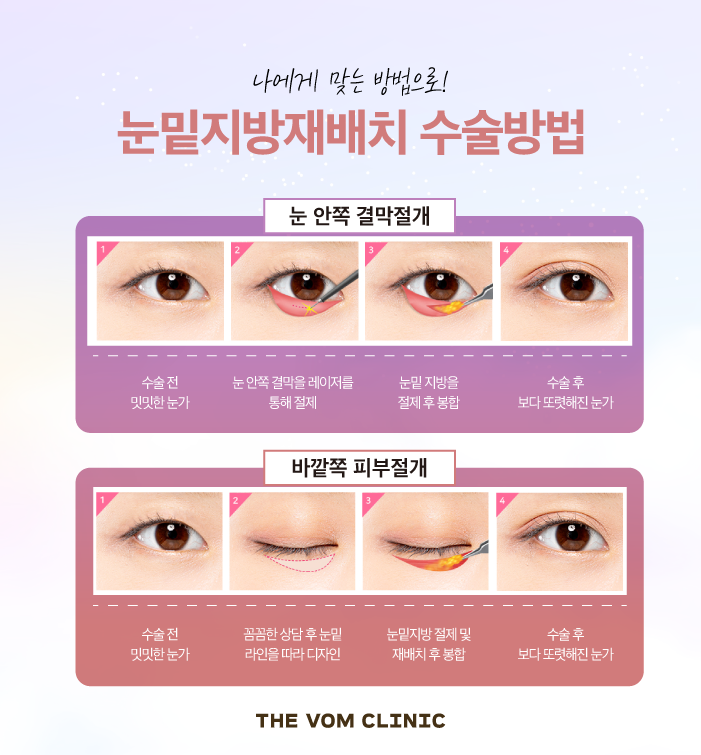 결막을 통해 눈 밑 부분을 제거하거나 재배치하여 자연스러운 눈 밑 라인을 만듭니다.